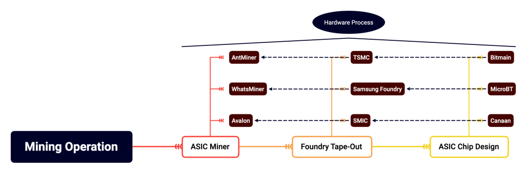 The diagram below shows the relationship between major foundry fabrication factories and bitcoin ASIC chip design and manufacturing companies.