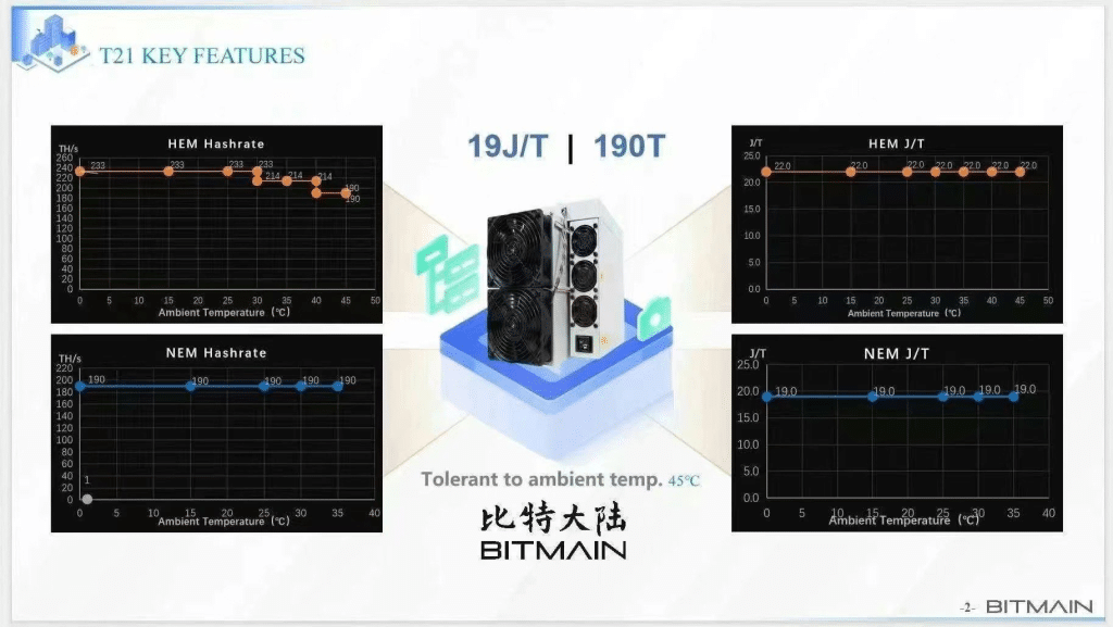 Bitmain stated that the T21 model can switch between what it calls Normal Energy Mode (NEM) and High Energy Mode (HEM). The NEM mode offers 19J/TH efficiency, producing 190 TH/s, while the HEM mode sacrifices some efficiency, at 22J/TH, in exchange for higher computational power, reaching up to 233 TH/s.