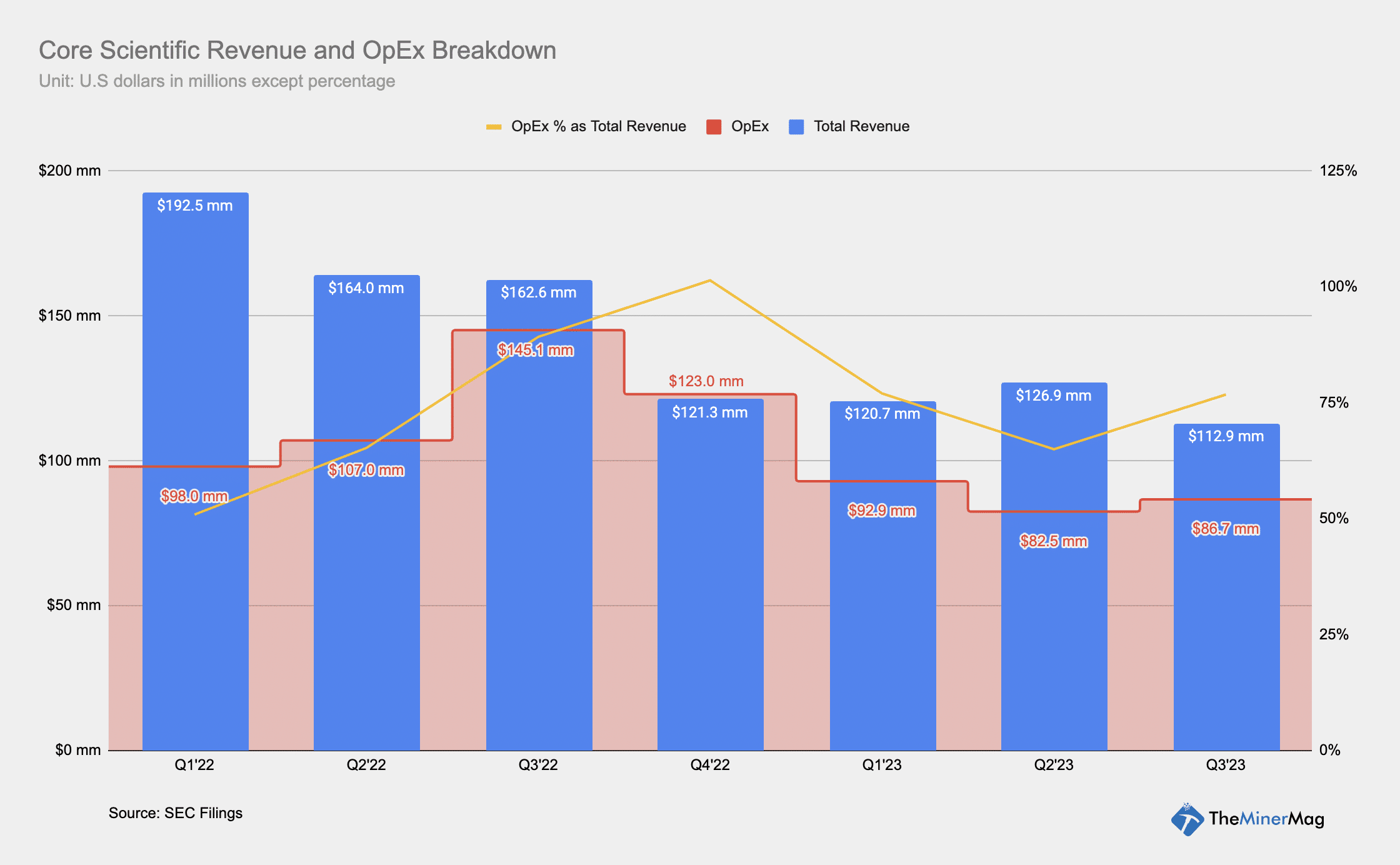In a Q3 filing on Monday, Core Scientific reported a total revenue of $112.9 million from its proprietary mining and hosting segments, down from $126.9 million in the previous quarter. It’s worth noting that Q3’s revenue was even lower than those of Q4’22 and Q1’23, when bitcoin’s average prices were around $20,000.