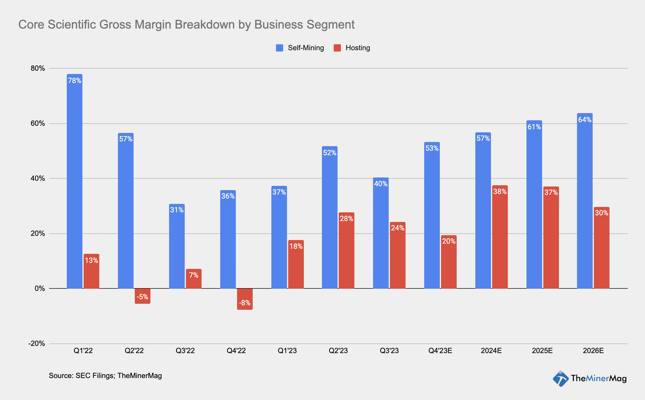 Below is a gross margin breakdown for Core’s self-mining and hosting businesses, considering only cash-based COGS in each segment and excluding SG&A expenses. The projected gross margin for Q4 and beyond is based on Core’s latest estimate as part of its Chapter 11 reorganization plan.
