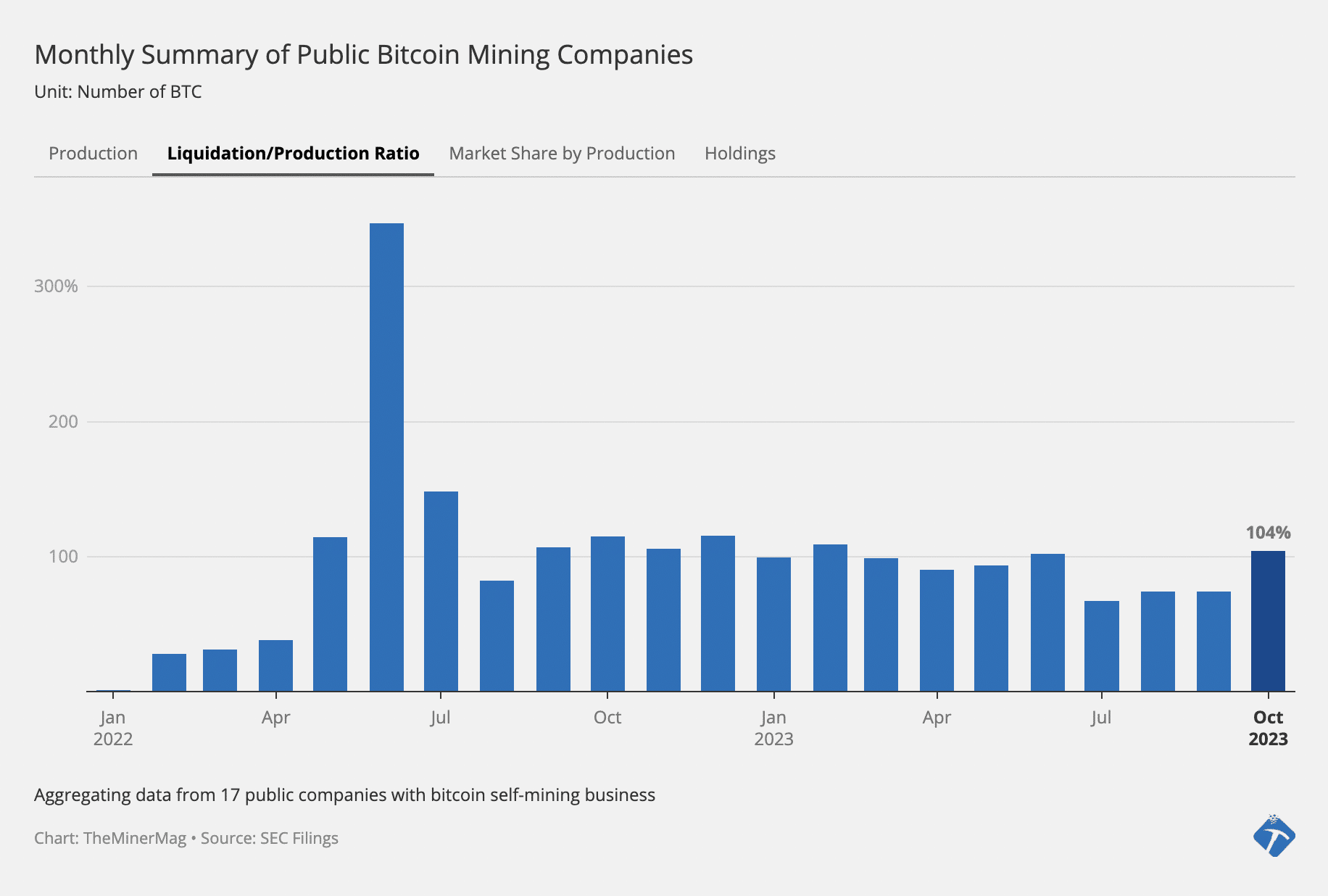 The amount of liquidation accounted for 100% of their combined bitcoin production last month. In comparison, the aggregated bitcoin liquidation-to-production ratio among public mining companies dropped to 70% during the summer.