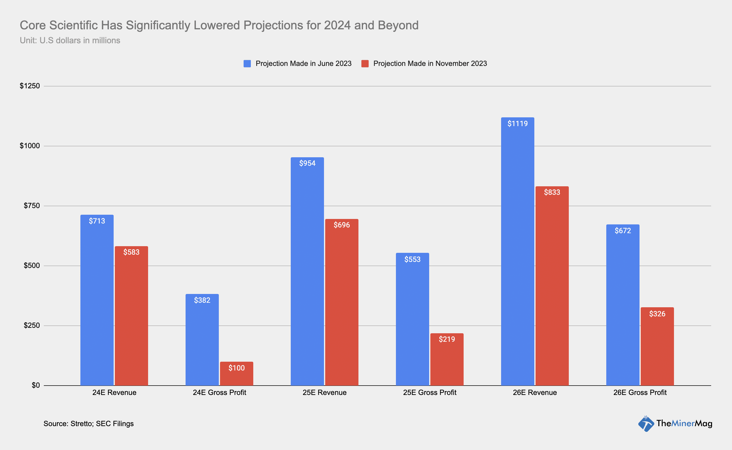 Meanwhile, Core Scientific has significantly revised down its revenue and gross margin projections for 2024 and the subsequent years, as illustrated in the chart below.