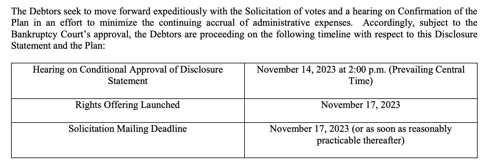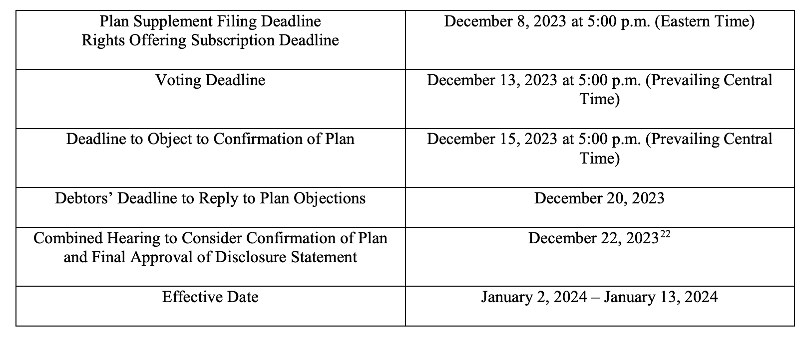 The envisaged timeline anticipates the plan to become effective between Jan. 2 and Jan. 13, contingent on several preconditions, including securing sufficient votes by Dec. 13 from its Key Stakeholder Groups.