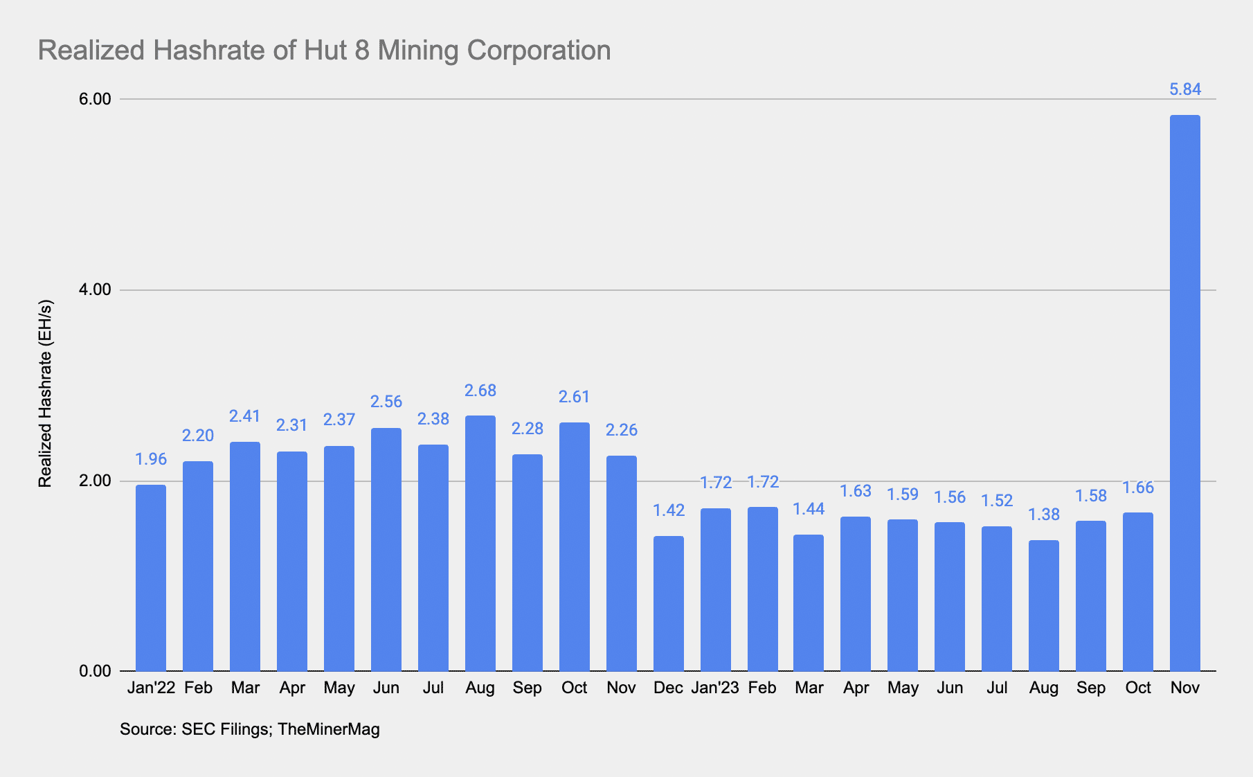 Hut 8’s November production update reflected an increase in realized hashrate, soaring to 5.84 EH/s following the expansion of proprietary mining capacity post the merger with USBTC.