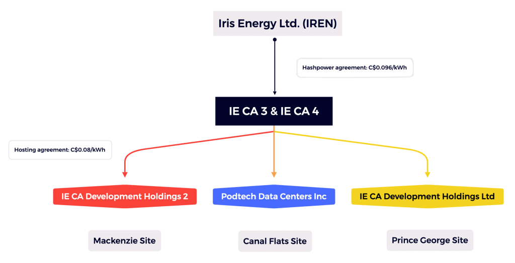 In a nutshell, the two SPVs work like this: they entered hosting agreements with three other IREN subsidiaries to host and manage the financed miners at a cost of C$0.08/kWh; they also signed a hashpower agreement with IREN, selling the parent entity hashpower services for a fee of C$0.096/kWh. From IREN’s perspective, the two SPVs generated income not by exactly bitcoin mining but rather from selling hashrate to IREN. In IREN’s own arguments: “At no time has IE CA 3 or IE CA 4 ever mined, owned or possessed bitcoin.”